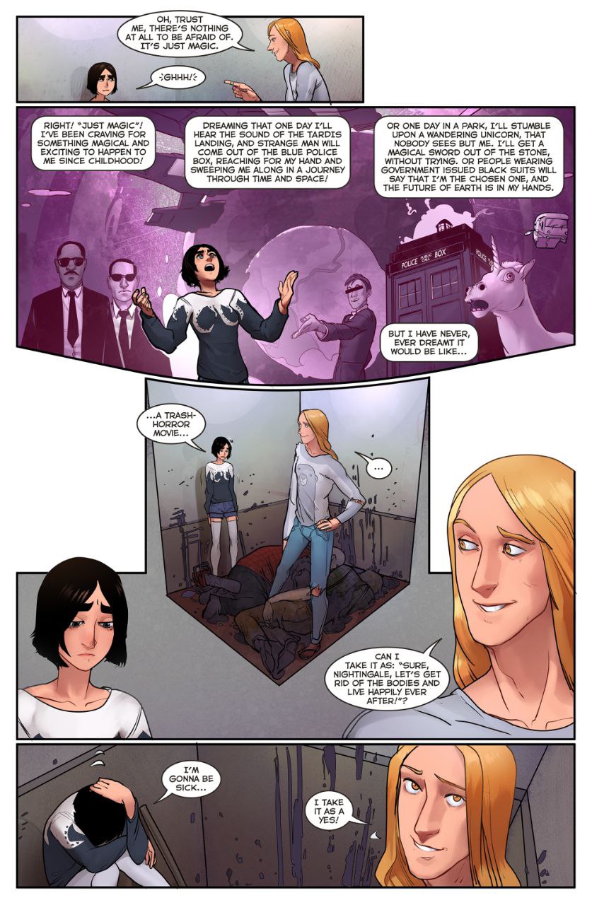 Многие часто задумываются о том, как хорошо было бы, если бы наши фантазии стали реальностью. Но правда ли это так? Все мы помним, что нужно бояться своих желаний. «Экслибриум» в том числе и об этом — как человеческие фантасмагории оборачиваются чем-то пугающим, принимают новую жуткую форму. В комиксе это выражено через разницу Лилиной жизни «до» и жизни «после» встречи с магией. Сначала девушка испытывает эйфорию, которая сменяется осознанием опасности нового этапа. Героиня задумывается, готова ли она отказаться от своей прошлой жизни. Перспектива бороться с чудовищными персонажами во благо реальности, хоть и привлекает экшеном, но совсем не входит в планы обычной студентки.